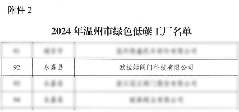 據(jù)今日永嘉消息 近日,溫州市經(jīng)濟(jì)和信息化局公布了2024年溫州市綠色低碳工廠名單,歐拉姆閥門科技有限公司等9家企業(yè)獲評(píng)2024年溫州市綠色低碳工廠。